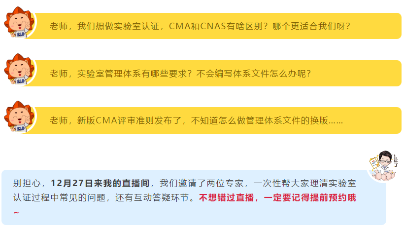 届时,两位老师将在直播间帮大家一次性理清CMA和CNAS的区别,解读新准则变化,并给出管理体系转换建议,同时还会分享一些精彩的客户案例。小伙伴们也可以提前梳理一下自己想要咨询的问题或者实验室面临的问题,直播间互动起来,就有机会取得老师的答疑解惑哦!
