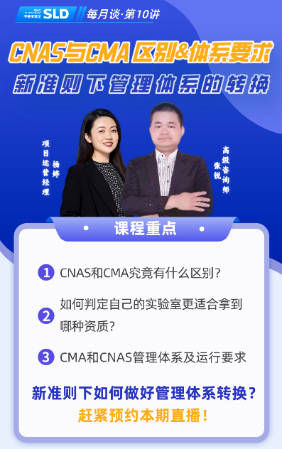 凯发K8天生赢家一触即发邀请了SLD高级咨询师张锐老师与SLD项目运营经理杨婷共同做客“SLD·每月谈”直播间,与大家分享《CMA与CNAS区别&体系要求——新准则变化与管理体系转换建议》。